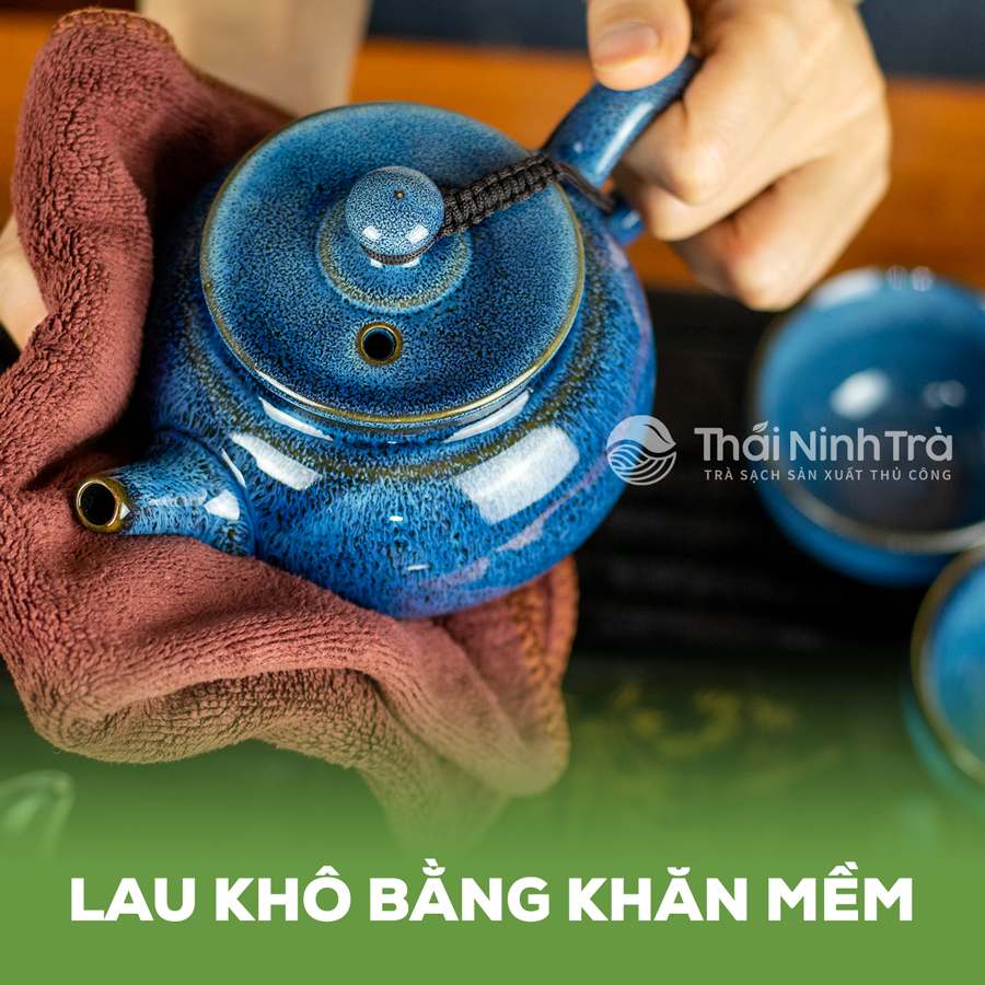 Dùng khăn vải mềm khô, lau nhẹ nhàng khắp bề mặt trong và ngoài của ấm, cả phần nắp ấm, phần quai ấm, tránh để nước nóng sau khi rửa còn đọng lại lau trên ấm.