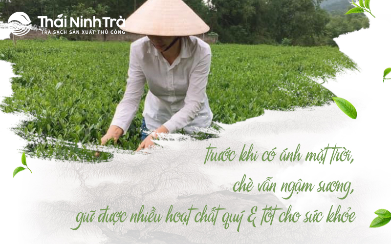 Vì buổi sáng sớm, trước khi có ánh mặt trời, chè vẫn ngậm sương, giữ được nhiều hoạt chất quý tốt cho sức khỏe. Búp trà được hái sớm mai luôn có độ giòn, tươi, không dai, lá trà không héo, vị trà thanh, chát nhẹ không đắng.