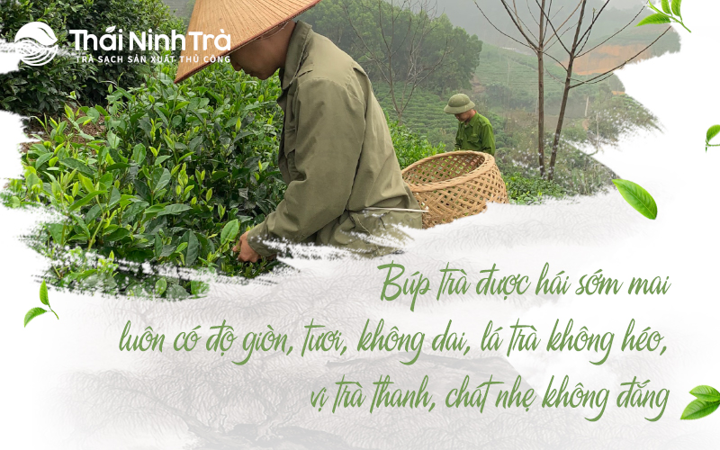 Thu hái chè vào sáng sớm cũng là một yêu cầu tiên quyết để Thái Ninh Trà làm ra sản phẩm trà giữ được hương vị truyền thống.